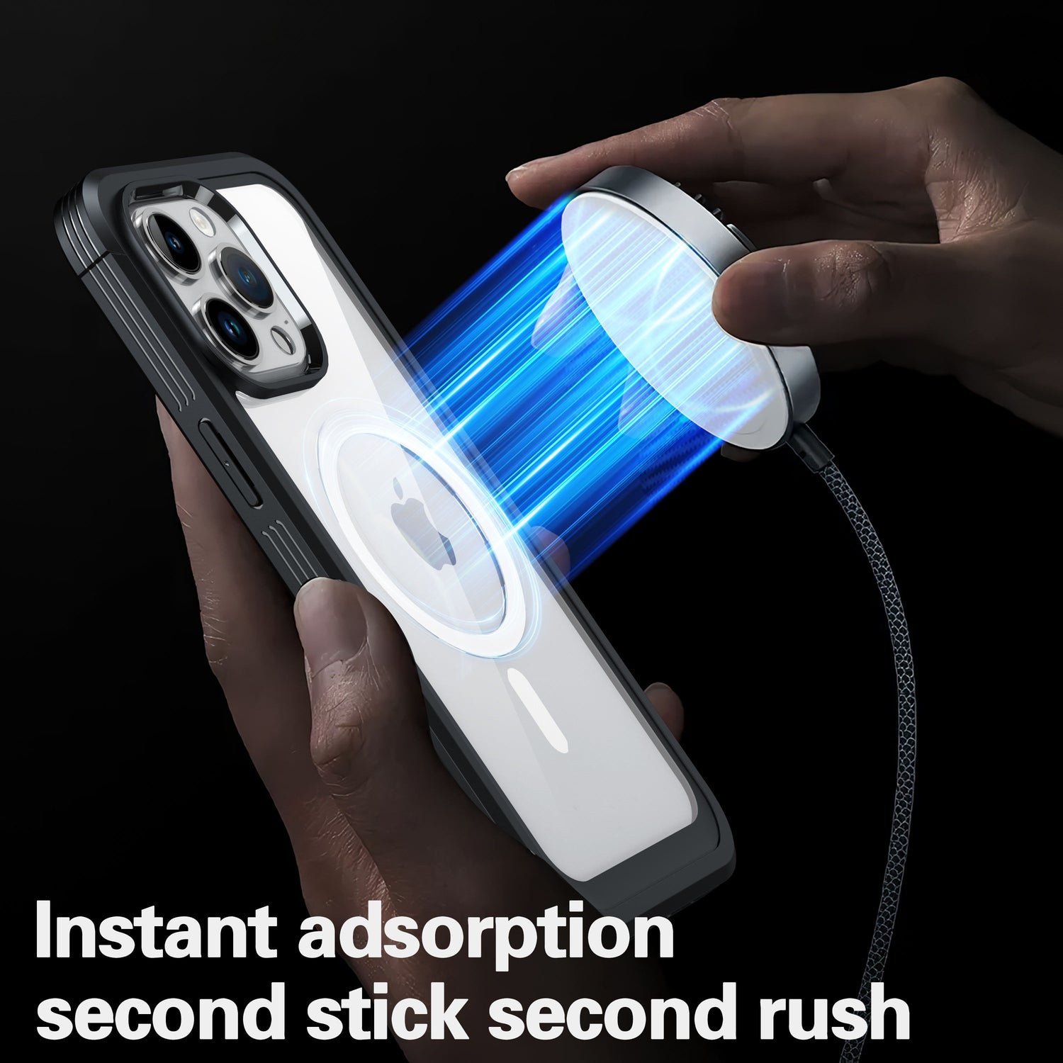 Profitez de latechnologie MagSafe Ă son maximum. GrĂące Ă son aimant puissant intĂ©grĂ©, cette coque garantit une fixation magnĂ©tique instantanĂ©e de votre chargeur MagSafe. Fini les branchements classiques : il suffit dâapprocher le chargeur, et il se connecte en une seconde.