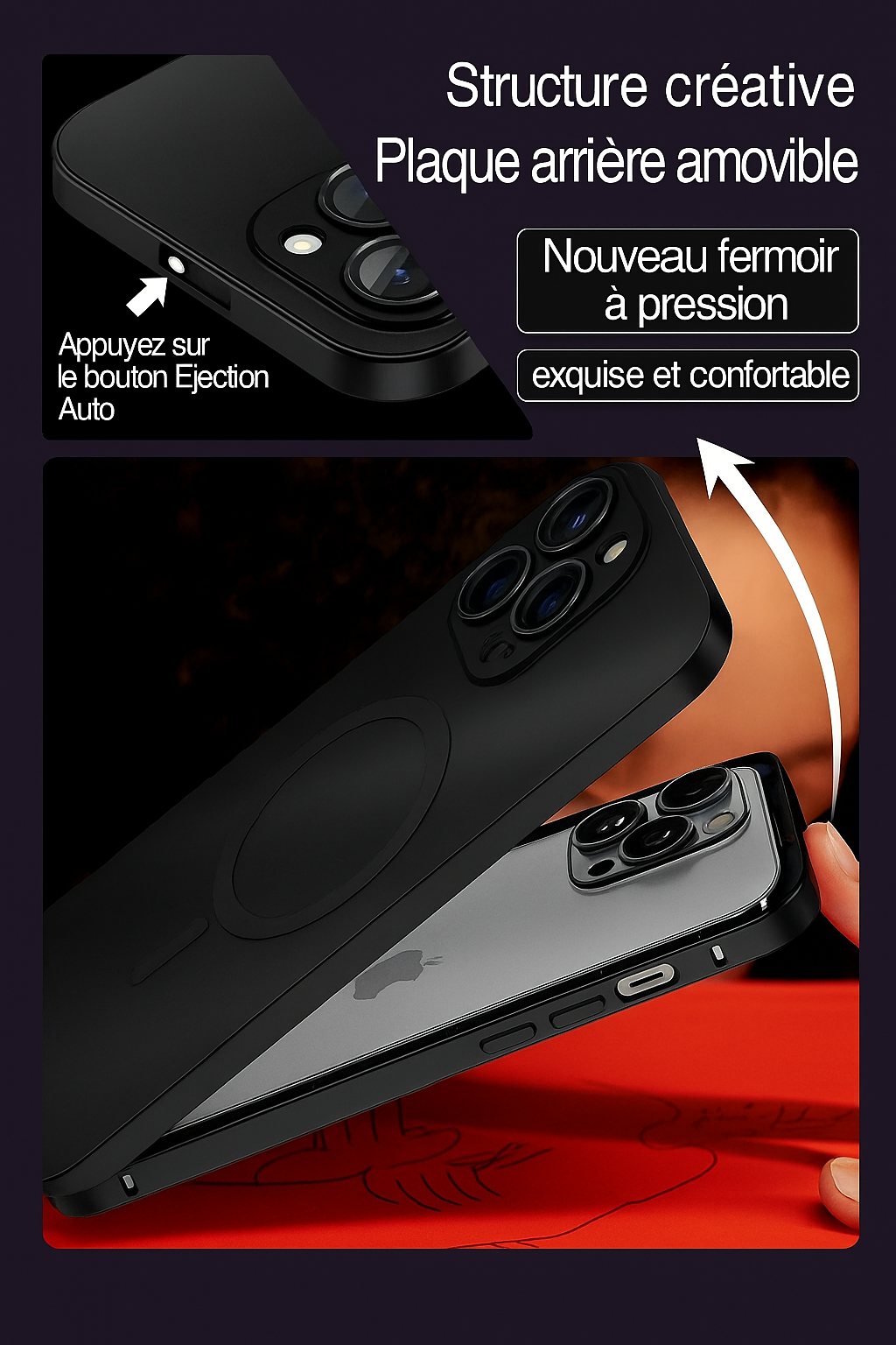 Grâce à sa plaque arrière amovible et son système d’éjection auto, changez de style ou nettoyez votre coque en un clic. Confort et technologie au service de votre iPhone.